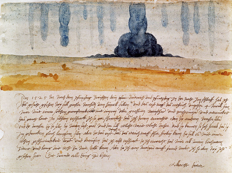 L’année 1525, dans la nuit du mercredi au jeudi après la Pentecôte, je vis en rêve ce que représente ce croquis ; une multitude de trombes d’eau tombant du ciel. La première frappa la terre à une distance de quatre lieues ; la secousse et le bruit furent terrifiants, et toute la région fut inondée. J’en fus si éprouvé que je m’éveillai. Puis, les autres trombes d’eau, effroyables par leur violence et leur nombre, frappèrent la terre, les unes plus loin, d’autres plus près. Et elles tombaient de si haut qu’elles semblaient toutes descendre avec lenteur. Mais, quand la première trombe fut tout près de terre, sa chute devint si rapide et accompagnée d’un tel bruit et d’un tel ouragan que je m’éveillai, tremblant de tous mes membres, et mis très longtemps à me remettre. De sorte qu’une fois levé, j’ai peint ce qu’on voit ci-dessus. Dieu tourne pour le mieux toutes choses.