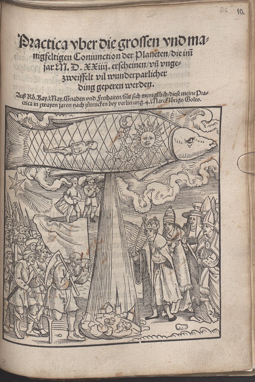Sous le signe de la constellation des poissons, la rencontre entre l’ordre supérieur de l’empereur, du pape, des cardinaux, à droite et un groupe de paysans armés à gauche. Dans le corps du poisson à l’avant la rencontre en février 1524 de la Lune, du Soleil, de Saturne, Jupiter, Mars et Venus associés à une mort annoncée. Le groupe de paysans accompagné de musiciens semble dirigé par un vieil homme avec des béquilles et une faux symbolisant le dieu Saturne, le dur labeur, la mélancolie, le malheur. Du poisson sortent des trombes d’eau qui inondent la ville.
