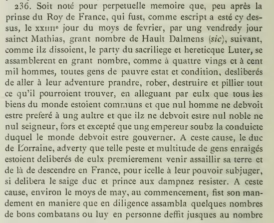Résumé du texte ci-dessus : Peu après l’emprisonnement du roi de France, le 24 févier 1525 à Pavie, un grand nombre de hauts-allemands, alléguent que tous les biens étaient communs, que les hommes étaient égaux et qu’ils ne voulaient reconnaître aucun seigneur excepté l’empereur. C’est la perception que l’on a des événements du côté du royaume de France. Outre son caractère séditieux antiféodal, l’on semble y voir surtout que les paysans sont derrière l’empereur alors que le royaume de France est affaibli.