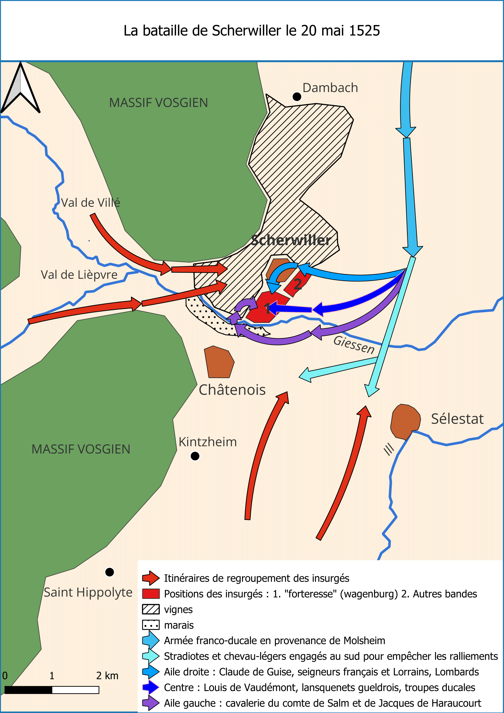 La bataille de Scherwiller oppose la bande d’Ebersmunster et ses alliés dirigée par Wolfgang Wagner, soit quelques 24000 hommes – sans compter les renforts attendus – à l’armée franco-lorraine qui n’a pas subi de grosses pertes. Pour elle, le site se nomme Chenonville. Le dispositif insurgé repose d’une part sur l’occupation de Scherwiller même, d’autre part sur le gros des troupes établi dans et autour d’un fort de chariots (Wagenburg). Le tocsin sonne l’appel aux renforts. Pressé par la noblesse alsacienne, le duc de Lorraine décide d’engager la bataille dès la fin de l’après midi du 20 mai. Elle durera jusqu’à la tombée de la nuit par l’achèvement des blessés et des fuyards. L’armée lorraine passera la nuit sur le champ de bataille avant d’engager son retour. Le bilan ? Au total 6000 tués dont les chefs du côté des insurgés et 500 dans le camp féodal. Ils s’ajoutent aux chiffres des précédentes batailles.