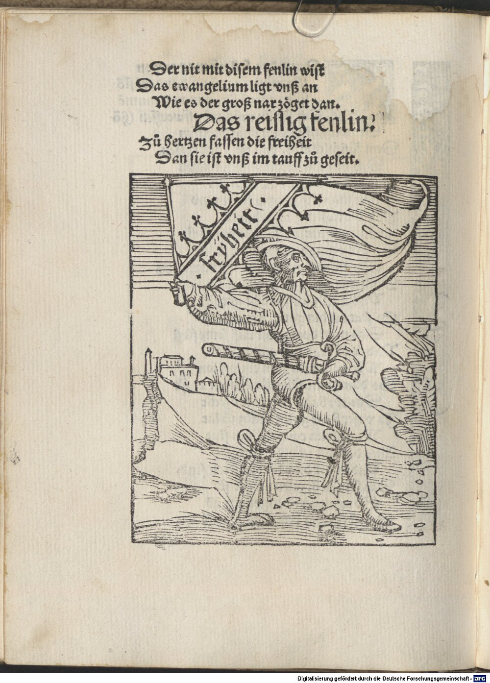 Gravure sur bois extraite du livre polémique de Thomas Murner Von dem grossen Lutherischen Narren (Du grand fou luthérien). Elle voulait montrer Martin Luther en dirigeant de la lutte armée. Strasbourg. 1522. Source : Staatsgalerie Stuttgart, Graphische Sammlung, alter Bestand