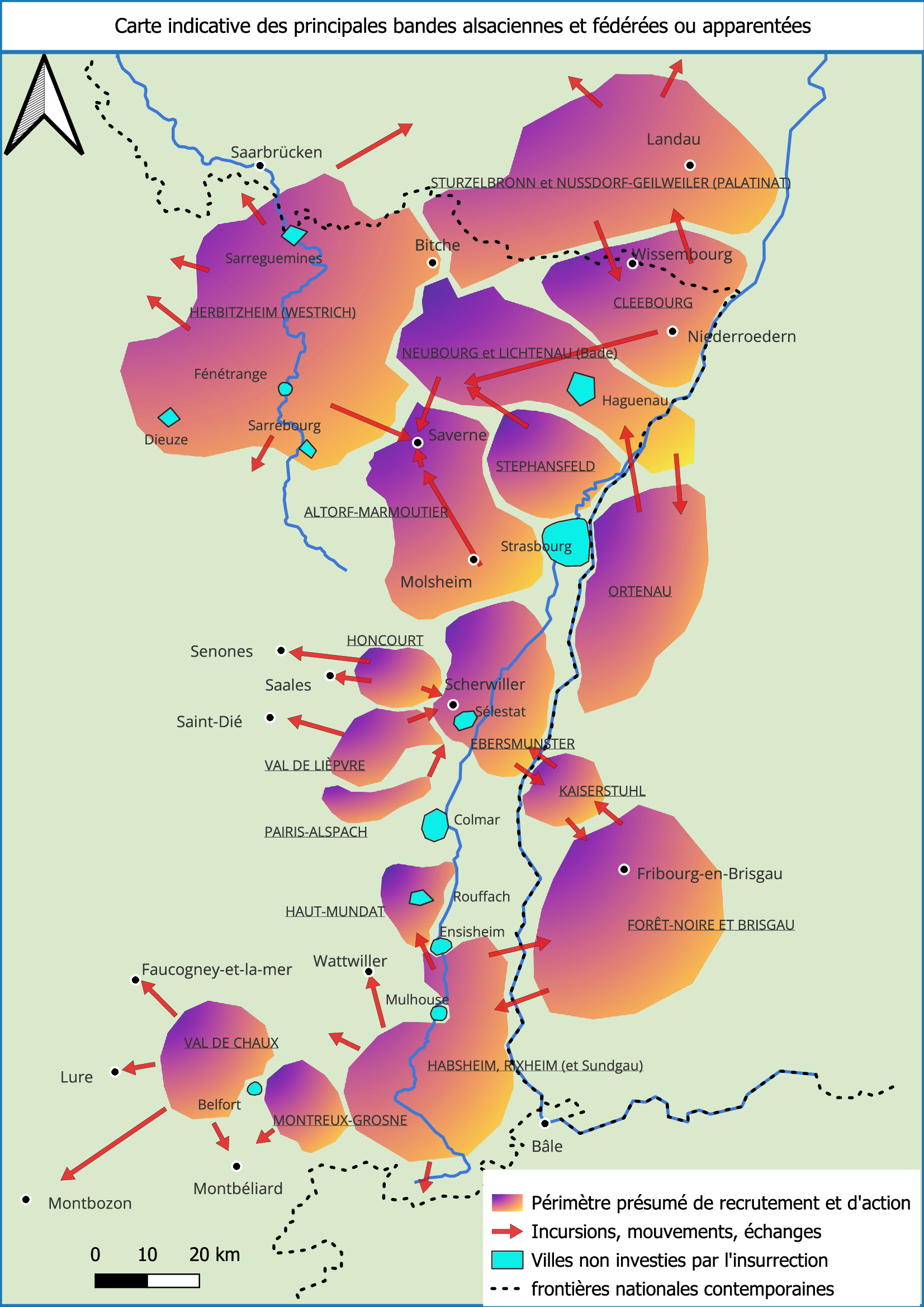 Nous voici revenus en Alsace où tout a commencé avec les révoltes du Bundschuh. L’insurrection déborde quelque peu ce territoire puisque les événement se déroulent non seulement de part et d’autre du Rhin mais s’étendent des Vosges et du plateau lorrain au Jura.