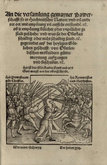 Frontispice de l’écrit anonyme An die Versammlung gemayner Pawerschafft, die in hochdeutscher Nation und vielen anderen Orten mit Empörung und Aufruhr entstanden ist, etc. Ob ihre Empörung in gerechter oder ungerechter Weise geschieht und was sie der Obrigkeit schuldig oder nicht schuldig sind, etc. Gegründet auf der Heiligen Schrift, von oberländischen Mitbrüdern guter Meinung verfasst und beschrieben, etc. « A l’assemblée de la commune paysannerie, qui s’est soulevée avec indignation et par des émeutes dans le sud de la nation allemande et en mains autres endroits, etc. Pour savoir si leur indignation est justifiée ou non, et si l’autorité est coupable ou non, etc. Fondé sur les saintes écritures, conçu et décrit par des frères du pays haut, de bonne opinion, etc » (Source)