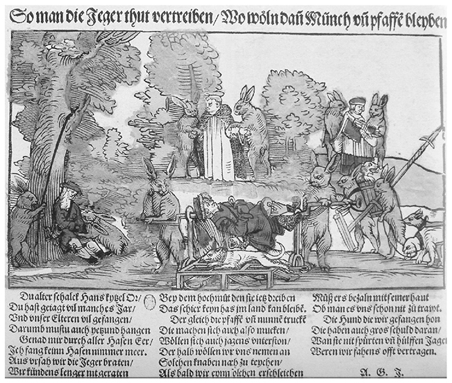 Gravure satirique allemande contemporaine des débuts de la Réforme sur le thème du monde à l’ envers. Les seigneurs ecclésiastiques sont directement visés. (Bibliothèque municipale de Colmar, Cabinet des Estampes)