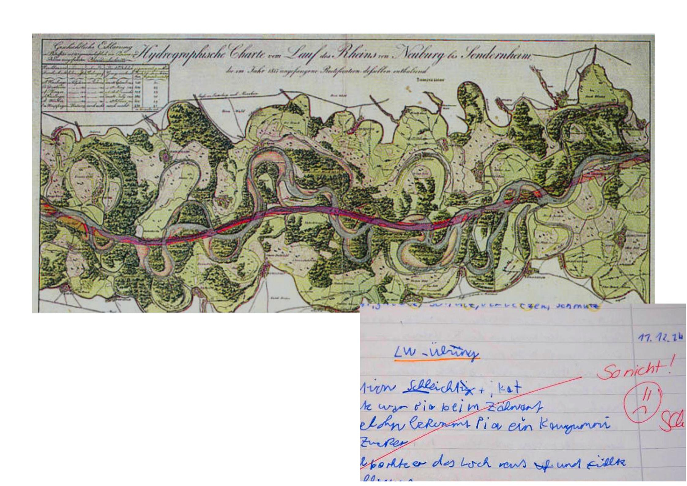 Non, Rhin, pas comme cela, so nicht, semble nous dire cette image. Tous ces pleins et déliés, n’importe comment, pas sur les lignes, et qui font des taches entre les boucles, il va falloir me corriger cela. Quand j’ai vu cette cartographie du Rhin et de sa correction future, cela m’a évoqué une écriture maladroite, gauche, voire écrite de la main gauche à une époque où l’on réprimait les gauchers, et le trait de plume rageur, à l’encre rouge des professeurs sur les copies d’élèves. Rouge est la couleur de la faute. L’analogie très subjective ne s’arrête pas là. Car il y a dans le rapport à la nature tel qu’on le concevait au 19ème siècle comme une attitude de maître d’école. Elle devait être corrigée voire domptée (gebändigt). Il y a bien sûr des raisons à cela mais le redressement, pour le policer, s’est fait au détriment des effets négatifs que cela allait entraîner.